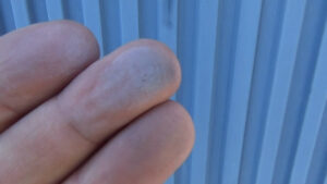 外壁を触ると、白い粉が手につく状態です。これは塗膜が紫外線で劣化しているサインです。
