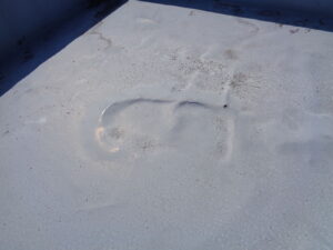 トップコートが劣化し、防水層が剥き出しになり始めているサインです。