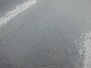 細かなひび割れ(ヘアクラック)が発生している場合、そこから水が浸入しやすくなります。浅いひびであればトップコートの補修で済みますが、深いひびは防水層そのものが傷んでいる可能性があります。
