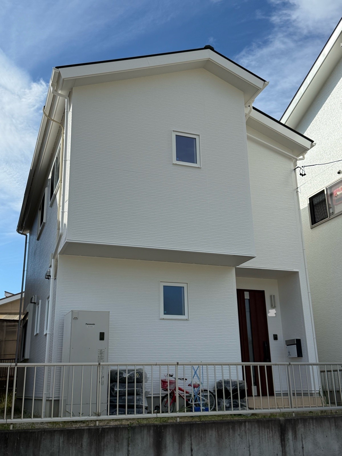 施工後のお住まいは、青空に映える真っ白な外観で、新築のような美しさを取り戻しました。