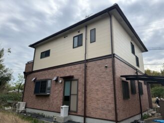 | 使用塗料 | 2F外壁 超低汚染プラチナリファイン2000無機-IR 【施工色:サンダルウット8086】 、1F外壁 スーパーSDクリヤー無機Ⅱ |