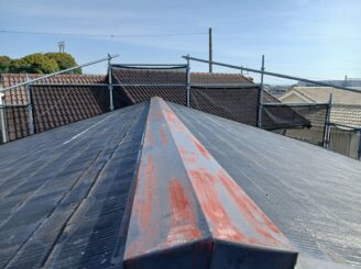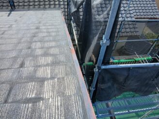 防水機能がない為水分を含み、苔や藻が発生し、屋根のケラバや水切りは錆が見られ塗膜がめくれていました。