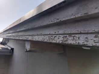 破風板や受樋、手すりなども塗膜がめくれており、雨戸のチョーキングも見られました。